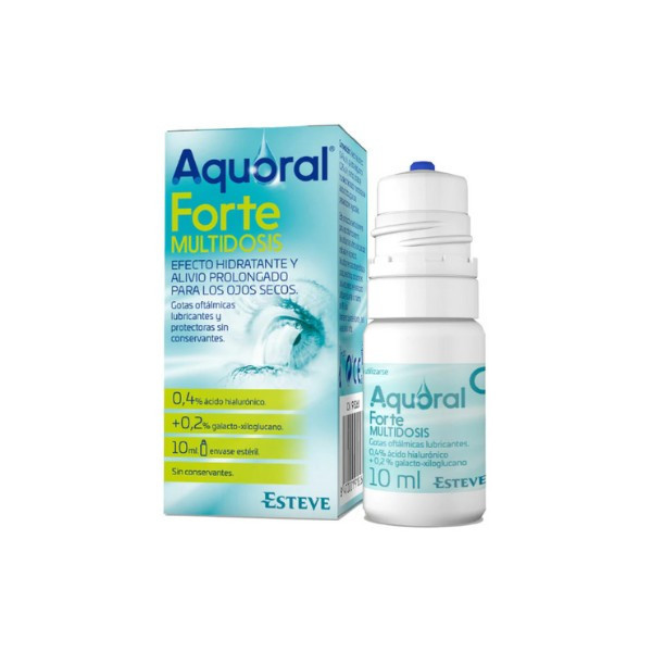 Aquoral Forte MULTIDOSE Gotas oftálmicas lubrificantes e protetoras lubrifica é uma solução oftálmica estéril, hidratante e lubrificante. A sua fórmula combina ácido hialurónico de alto peso molecular, com efeito hidratante, e galacto-xiloglucano, que forma uma camada protetora na superfície ocular. Esta combinação ajuda a prevenir irritações causadas por fatores ambientais (vento, sol, fumo, ar seco), stress visual (exposição excessiva à luz, uso prolongado de computadores) ou fatores mecânicos (lentes de contacto, pós-cirurgia ocular), enquanto promove a lubrificação, mesmo nos casos mais graves de desconforto. Não contém conservantes nem fosfatos e é adequado para uso com lentes de contacto.