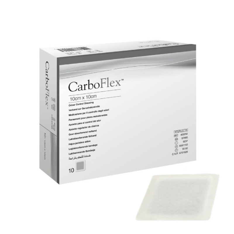 Carboflex é um penso de cinco camadas especificamente desenvolvido para a gestão de feridas com odor. Este penso apresenta uma camada de contacto absorvente, uma camada de carvão activado como camada central e a camada de película EMA, que mantém a integridade do penso e retarda o extravasamento do exsudado. Resistente à água.