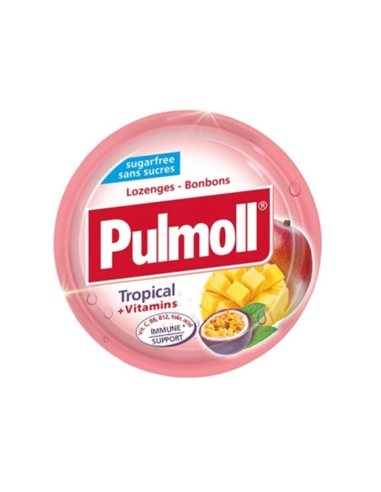 Pulmoll Tropical + Vitaminas é uma pastilha sem açúcar com propriedades calmantes, indicada em casos de rouquidão, tosse ou irritação da garganta, problemas de boca seca, fumadores e diabéticos. A sua composição contém Stevia, um adoçante natural; Isomalte, substituto do açúcar, contribuindo assim para a manutenção da mineralização dentária. Sem lactose. Sem glúten.