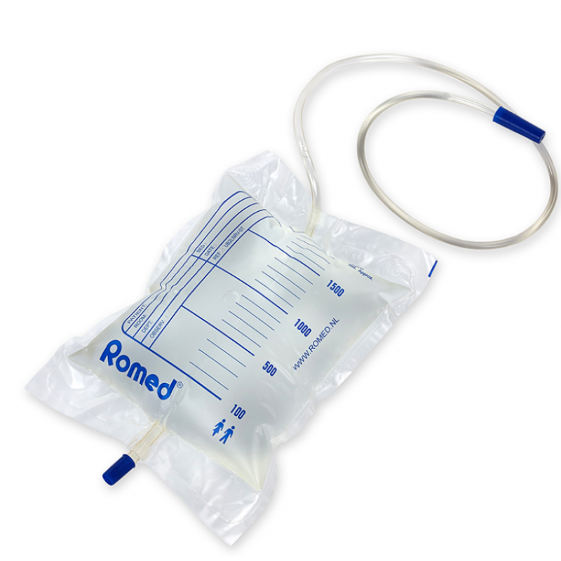 Sacos de urina com válvula anti-retorno e dispositivo de saída em cruz esterilizados com capacidade de 2 L.